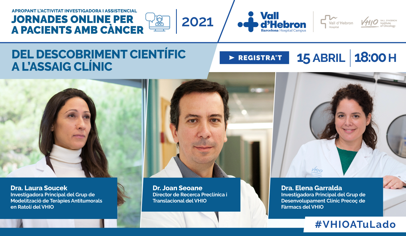 Des del Vall d’Hebron Institut d’Oncologia (VHIO) i l’Hospital Universitari Vall d’Hebron hem organitzat unes jornades online per a pacients amb càncer i els seus familiars per a explicar en quines línies d’investigació s’està treballant actualment en diferents tipus de càncer, comentar els nous tractaments que s’estan desenvolupant o per aclarir els dubtes més freqüents que puguin sorgir relacionats amb aquests i altres temes.