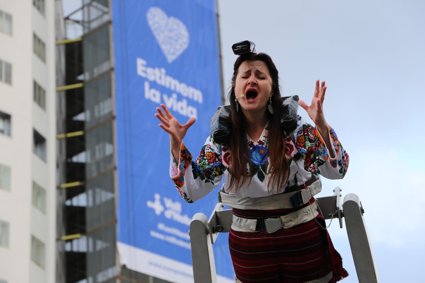 Una lona gegant s’ha desplegat des del capdamunt de la torre de l'Hospital Infantil i Hospital de la Dona amb el missatge ‘Estimem la vida’, dirigit a tota la societat, abans de l’espectacle de La Fura dels Baus.