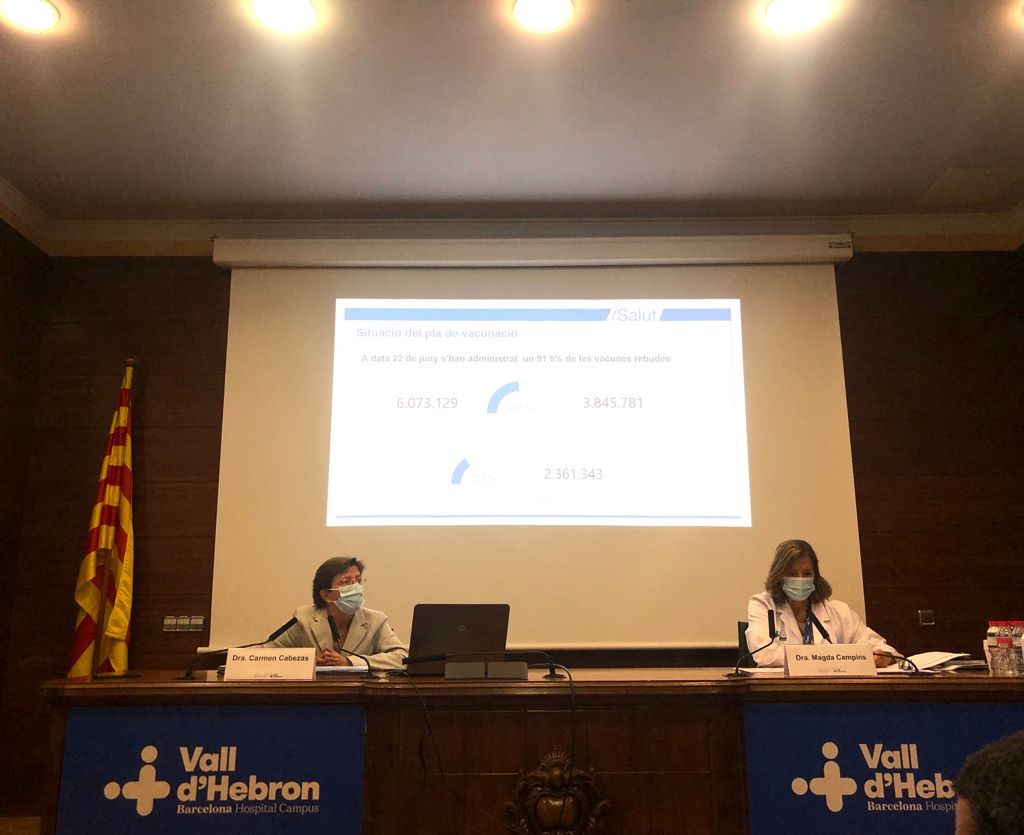 L'habitual roda de Premsa per informar sobre el ritme de la vacunació enfront la COVID-19 a Catalunya s'ha fet avui des de l'Hospital Universitari Vall d'Hebron. La Dra. Magda Campins, cap de Medicina Preventiva i Epidemiologia de Vall d'Hebron, ha acompanyat a la Dra. Carmen Cabezas, secretària de Salut Pública, per fer balanç de la vacunació enfront a persones d’alt risc ateses als hospitals catalans. Des del 16 de febrer, els 40 hospitals de Catalunya han administrat 274.718 dosis als pacients vulnerables. “Hi ha hagut una gran acceptació de la vacuna entre aquest grup de pacients d’alt risc”, ha destacat.