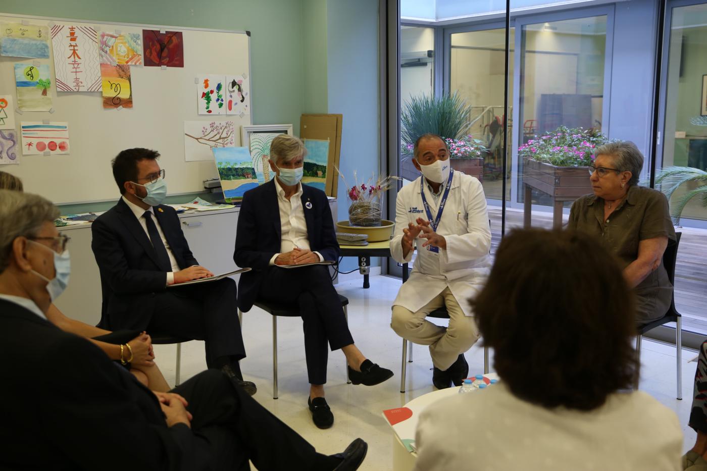 El president de la Generalitat, Pere Aragonès, i el conseller de Salut, Josep Maria Argimon, han visitat avui Vall d'Hebron Barcelona Hospital Campus per conèixer de primera mà l’atenció integral a les persones amb esclerosi múltiple que porten a terme el Servei de Neurologia de Vall d’Hebron, el Centre d’Esclerosi Múltiple de Catalunya (Cemcat) i la Fundació Esclerosi Múltiple (FEM). El Dr. Albert Salazar, gerent de l’Hospital Universitari Vall d’Hebron, Mari Àngels Barba, directora d’Infermeria de l’Hospital Universitari Vall d’Hebron, el Dr. Jaume Sastre-Garriga i la Dra. Mar Tintoré, subdirector i responsable assistencial del Cemcat respectivament, a més de neuròlegs de l’Hospital Universitari Vall d’Hebron, la presidenta de la Fundació Esclerosi Múltiple de Catalunya (FEM), Maria José Abella, i la directora de la FEM, Rosa Masriera, els han acompanyat durant el seu recorregut per les instal·lacions del Cemcat i els han explicat la tasca que els professionals sanitaris porten a terme per millorar la qualitat de vida dels pacients amb esclerosi múltiple, una malaltia neurodegenerativa i crònica del sistema nerviós central, sovint generadora de discapacitat, que a Catalunya pateixen 139 pacients per cada 100.000 habitants.