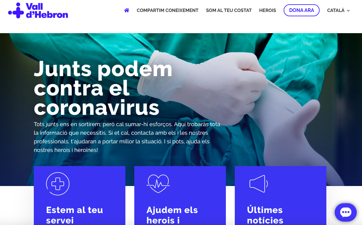 El web coronavirus.vallhebron.com ha rebut 62.000 visites i 111.960 pàgines vistes durant els mesos més intensos de la crisi sanitària, del 27 de febrer al 25 de maig. Aquest web ha aglutinat durant la pandèmia tota la informació de salut i les últimes notícies, així com les vies de comunicació per demanar suport emocional de forma telemàtica i o demanar ajuda a Atenció Ciutadana. Tota aquesta informació s’ha acompanyat de vídeos i infografies per fer més entenedor i didàctic el contingut per als ciutadans. La pàgina també ha servit per aglutinar totes les maneres de col·laborar amb Vall d’Hebron, des de la captació de fons per la recerca i la transformació de l’Hospital fins a missatges de suport, tant per a pacients com a professionals. S’han rebut 922 missatges.