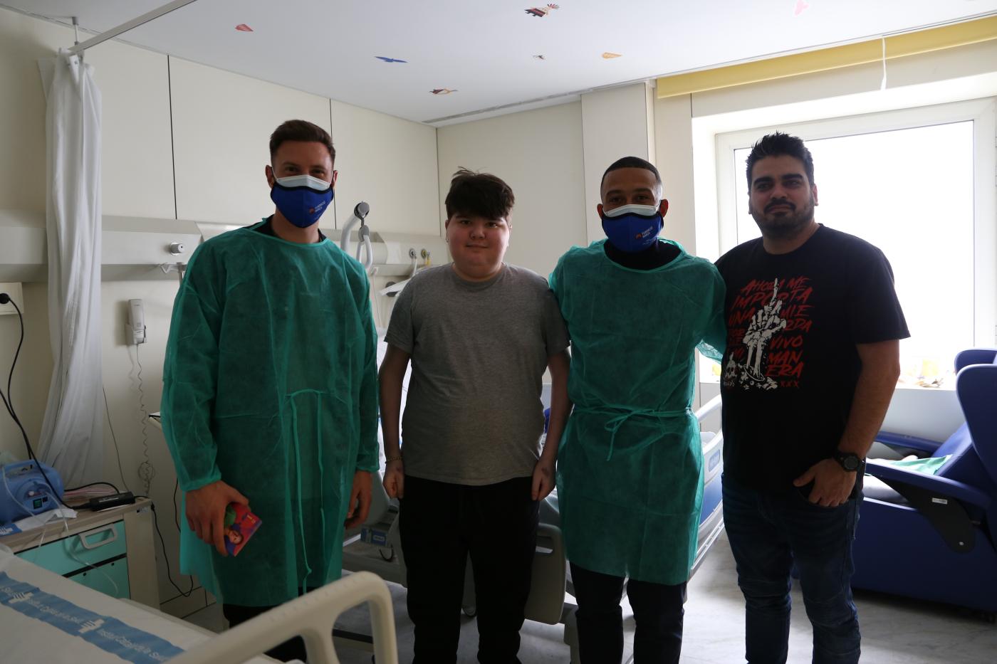 El porter del FC Barcelona, Marc ter Stegen; Ousmane Dembélé, Memphis Depay; Frank Kessié i Arnau Tenas, acompanyats del segon entrenador del Barça, Òscar Hernández i Elena Fort, en nom de la directiva, porten alegria a l’Hospital Infantil de Vall d’Hebron.