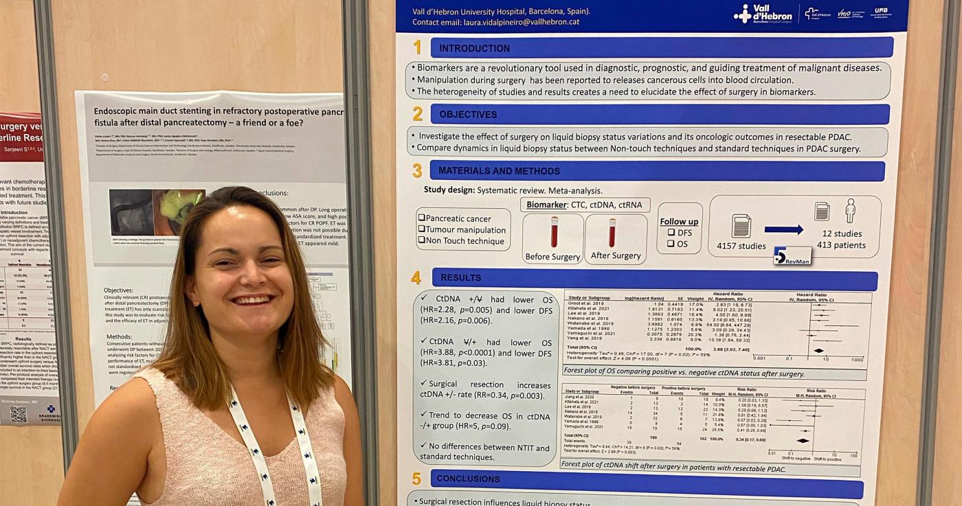Finalment, el treball de la Dra. Laura Vidal, del Servei de Cirurgia Hepatobiliopancreàtica i Trasplantaments de l'Hospital Vall d'Hebron i investigadora del VHIR, va servir per comprovar si és certa la hipòtesi que la manipulació tumoral durant l'operació allibera elements tumorals a la circulació sanguínia i si això influeix en la supervivència dels pacients. L'equip va realitzar una metaanàlisi d'estudis que tenien les dades de biòpsies líquides abans i després d'una operació d'extirpació d'un adenoma. Es va comprovar que molts més pacients passaven d'un índex tumoral positiu a negatiu després de la intervenció que a la inversa. Per tant, l'operació afectava positivament a l'índex tumoral. Tanmateix, en la minoria que passava de negatiu a positiu tenia un menor índex de supervivència a llarg termini. No es van percebre diferències entre operacions, ni es va poder establir una causa específica que provoca el canvi, l'equip postula que posteriors estudis podran dirimir aquestes incògnites.