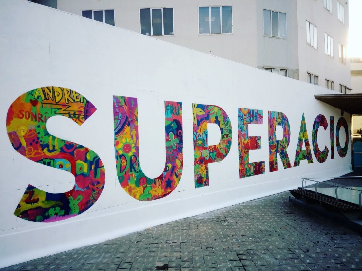 La paraula “Superació” ha estat pintada pels nens ingressats i el col·lectiu artístic Boa Mistura. Vall d’Hebron, el Museu Nacional i DKV Seguros s'han aliat en aquest projecte per acostar l'art a l'hospital.