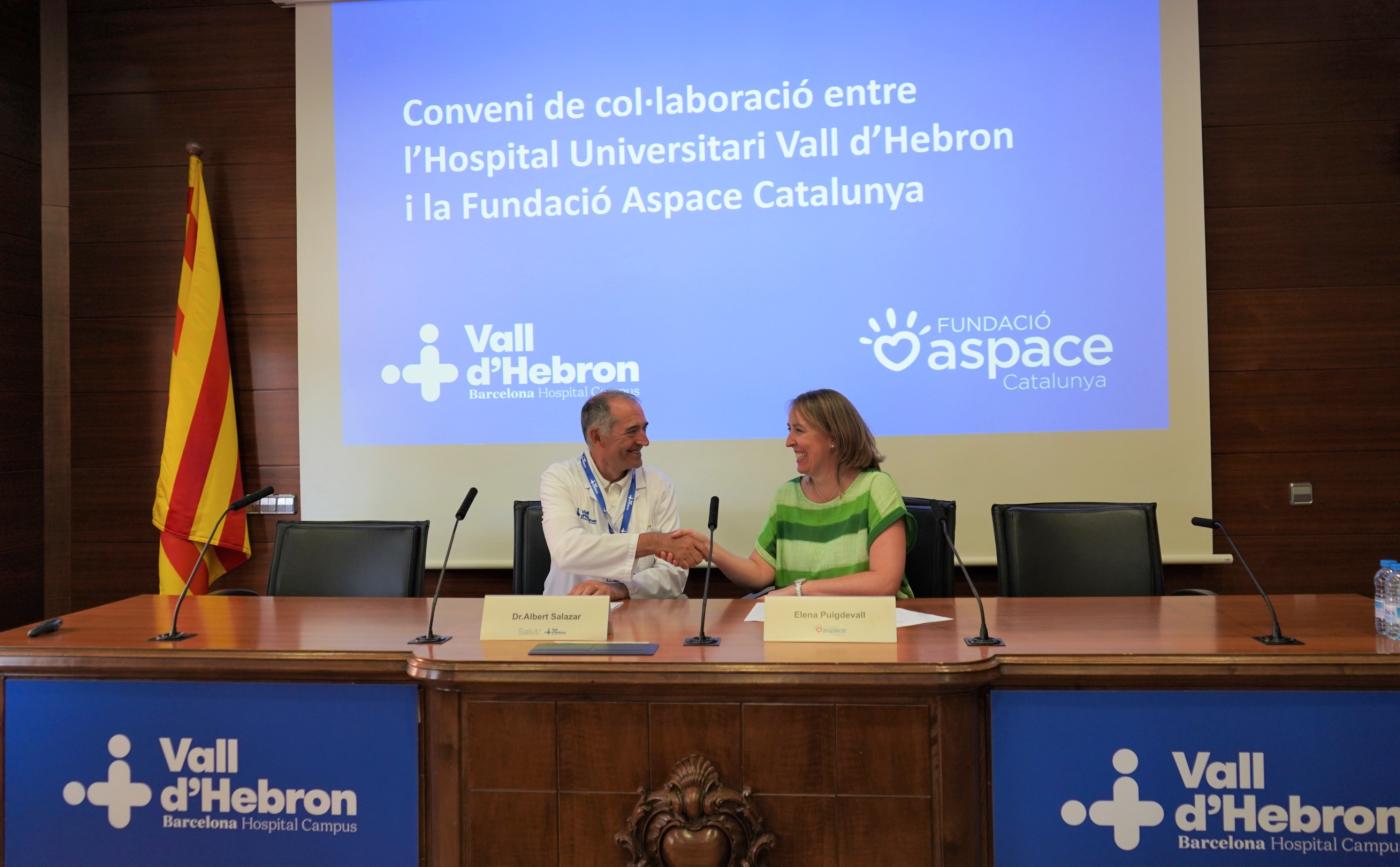 El Dr. Albert Salazar, gerent de l’Hospital Universitari Vall d’Hebron, i Elena Puigdevall, directora general de la Fundació Aspace Catalunya, signen un conveni de col·laboració.