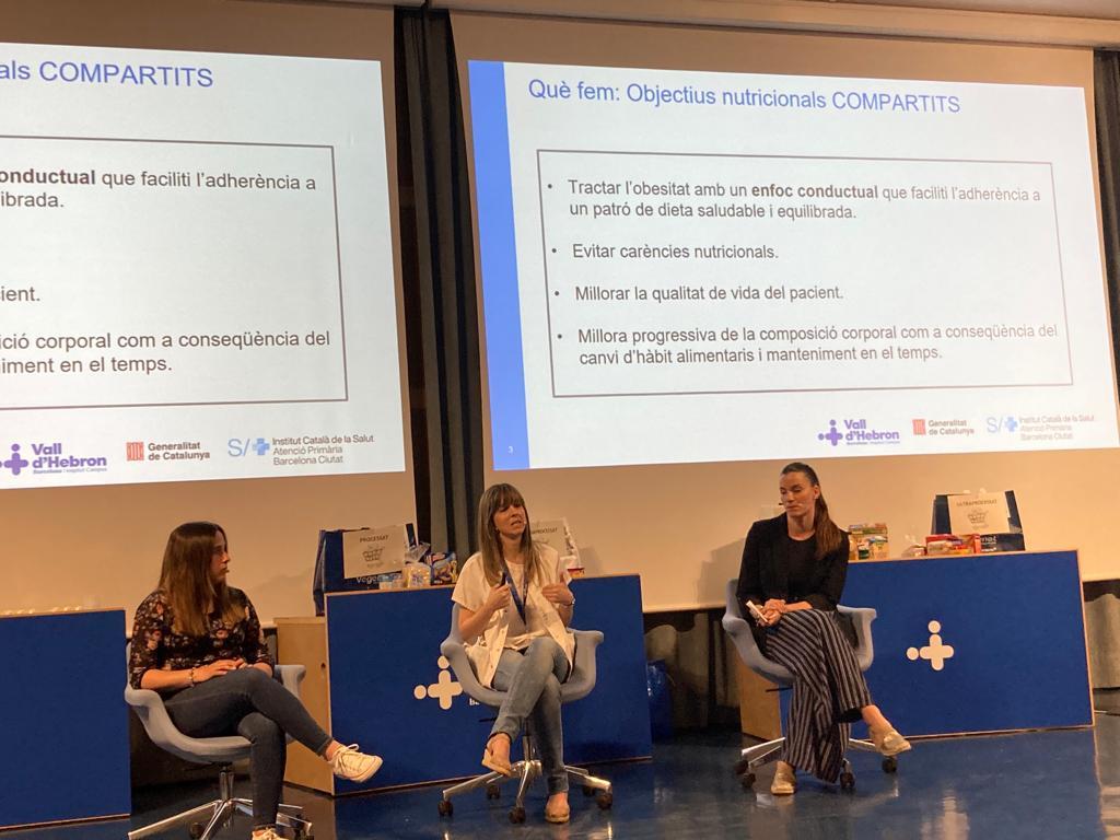 El segon dia de la jornada ha abordat una dimensió molt més pràctica. S’han realitzat tallers sobre nutrició i activitat física tant per a professionals sanitaris com per a pacients. Els tallers de nutrició han estat liderats per la Dra. Marta Comas, primera doctora en Nutrició de l'Hospital Universitari Vall d’Hebron, i dietista-nutricionista de la Unitat de Tractament Integral de l’Obesitat, conjuntament amb un equip nutricionistes d’Atenció Primària. Alguna de les activitats que s’han dut a terme en aquests tallers ensenyaven als pacients i a professionals a llegir i interpretar les etiquetes nutricionals dels aliments, així com una degustació de productes dietètics. D’altra banda, els tallers d’activitat física han comptat amb la participació de César Bustos i Javier Butragueño, experts nacionals en exercici físic i vocals de la Junta directiva de la Societat Espanyola per l’Estudi de l’Obesitat (SEEDO). Els professionals sanitaris han assistit a una sessió pràctica sobre com prescriure exercici físic, i els pacients han gaudit d’una sessió teòrico-pràctica per posar en pràctica pautes i exercicis d'activitat física.