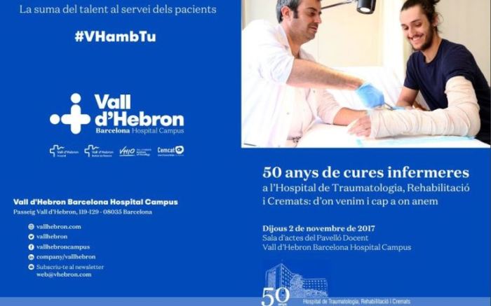 Vall d’Hebron Barcelona Hospital Campus organitza el dijous 2 de novembre un esdeveniment per homenatjar la fonamental feina de les infermeres. Per aquest motiu se cel·lebra la jornada “50 anys de cures infermeres a l’Hospital de Traumatologia, Rehabilitació i Cremats: d’on venim i cap a on anem”, a la Sala d’actes del Pavelló Docent.