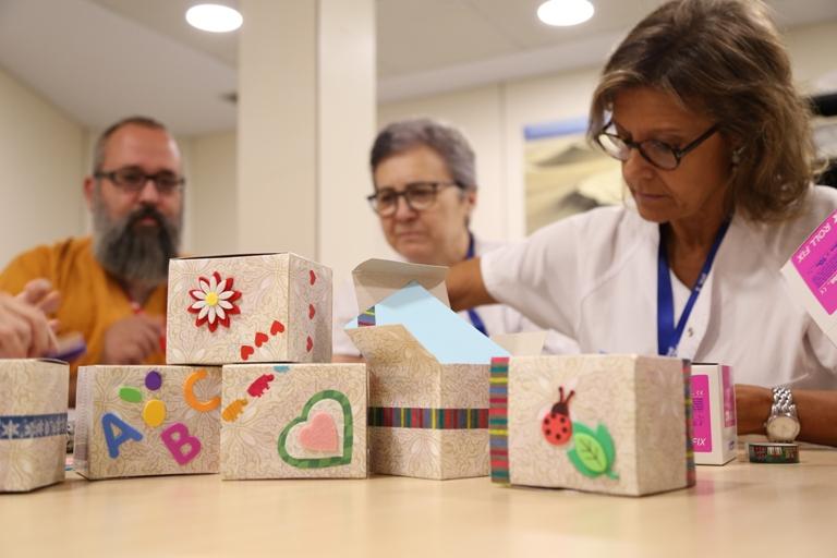 "Es tracta d'unes capses reutilitzades que nosaltres mateixes folrem amb paper decoratiu i adorns. Vam comprar els materials i cada vegada que tenim una estona lliure el dediquem a anar confeccionant les capses", explica Isabel Salgado, llevadora i supervisora d'Infermeria d'Urgències d'Obstetrícia i Ginecologia de Vall d'Hebron.