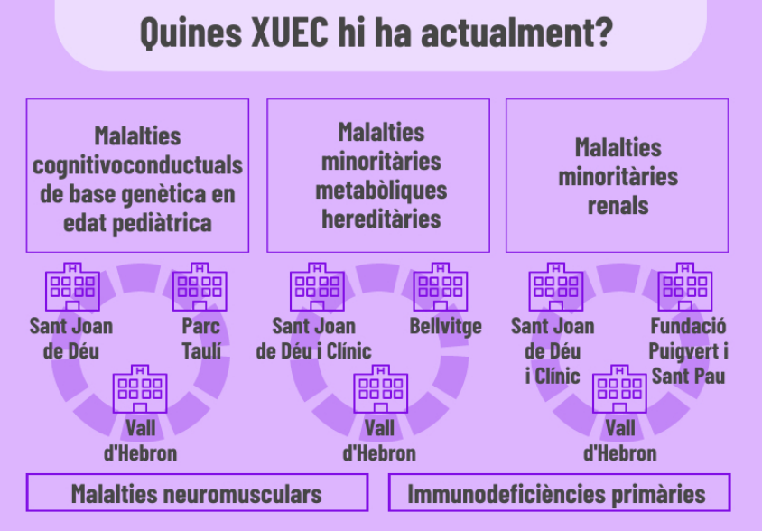 La funció principal d’aquestes unitats és fer el diagnòstic clínic i el pla d’atenció del pacient, que inclou l’estratègia terapèutica i l’estratègia de seguiment multidisciplinari de la persona afectada per una malaltia minoritària. També impulsar la recerca i el desenvolupament de noves teràpies, així com facilitar l’accés a nous tractaments via assajos clínics. En malalties minoritàries renals, l’Hospital Universitari Vall d’Hebron està acreditat com unitat d’expertesa clínica per atendre pacients pediàtrics i adults; Sant Joan de Déu, per atendre pacients pediàtrics, i l’Hospital Clínic per atendre adults. Mentre que la Fundació Puigvert-Sant Pau atén el gruix d’adults i està acreditada per atendre pacients pediàtrics, tot i que rep un número petit. Els quatre centres dibuixen la XUEC de malalties minoritàries renals. Vall d’Hebron compta amb totes les especialitats disponibles per atendre infants i adults, la qual cosa facilita la transició del pacient pediàtric a l’edat adulta.