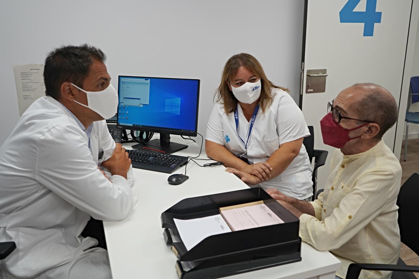 Pacient a la consulta amb el Dr. Oriol Bestard, cap del Servei de Nefrologia i Trasplantament Renal i Adela Amat, infermera supervisora de Trasplantaments.