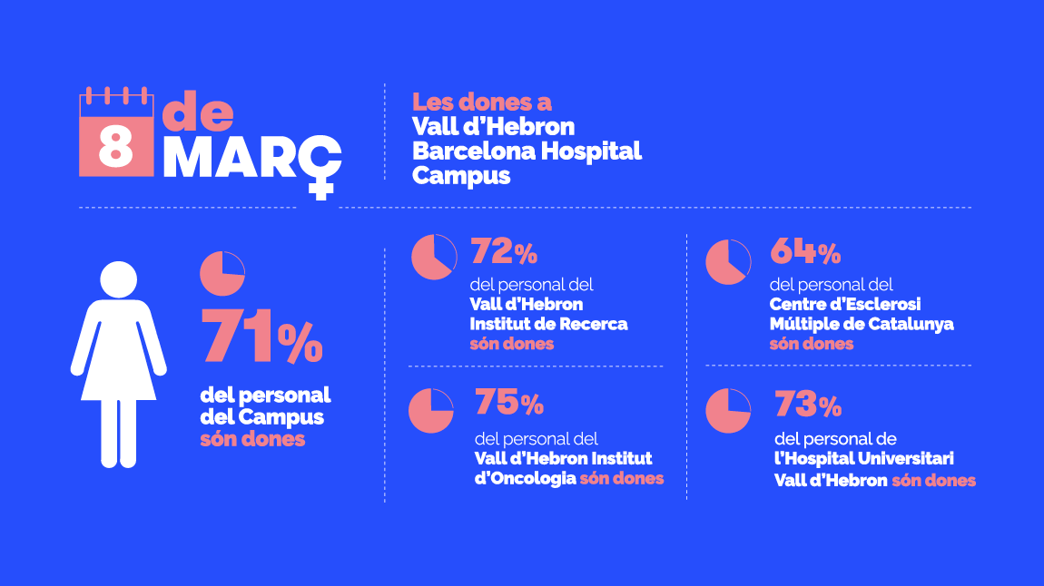 Des de 2011, el Vall d’Hebron Institut de Recerca (VHIR) compta amb un Pla d’Igualtat per garantir les mateixes condicions i oportunitats a homes i dones i contribuir al desenvolupament d’una societat més justa. El 72% del seu personal són dones. Entre el personal d'estructura i personal investigador i de suport a la recerca, el percentatge és molt similar. A estructura, el 71% del personal és femení, 127 dones i 53 homes. Entre el personal dedicat a la investigació i a donar suport a la recerca hi ha 388 dones i 147 homes, el que representa una quota femenina del 73%. No obstant això, si s'escala a posicions de major responsabilitat, és a dir, investigadores principals, caps de grup de recerca o coordinadores d'àrea, el percentatge de dones comença a disminuir. Enguany el percentatge de dones investigadores principals, és a dir, que lideren projectes de recerca s’ha equiparat al d’homes. Ara mateix, el 46% dels IPs són dones, 140 enfornt 167 homes. Pel que respecta a caps de grup de recerca, dels 62 caps de grup que hi ha, 14 són dones. I només dues dones que són coordinadores d'àrea (hi ha 8 àrees de recerca).