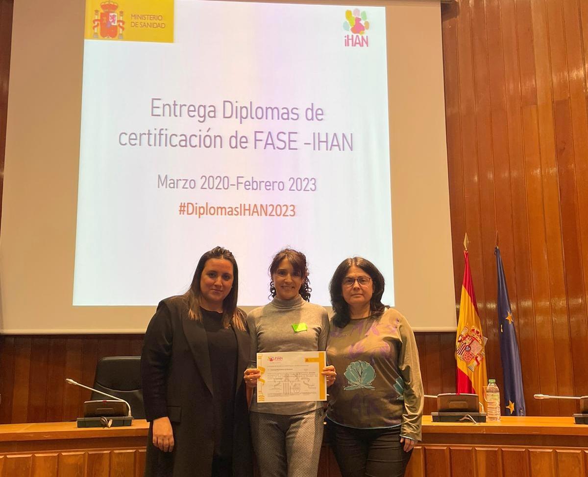 Representants de la Subcomissió de Lactància de Vall d’Hebron han recollit avui al Ministeri de Sanitat el certificat que acredita haver superat la Fase 1D (Fase de Descobriment) de la Iniciativa per a la Humanització de l’Assistència al Naixement i la Lactància (IHAN), una iniciativa llençada per l’Organització Mundial de la Salut (OMS) i Unicef. Un hospital o servei de salut IHAN està compromès amb pràctiques que protegeixin, promoguin i donin suport a la lactància materna exclusiva des del naixement. L’acreditació IHAN s’aconsegueix després d’haver superat un total de quatre fases: Vall d’Hebron ja ha aconseguit acreditar la primera. Aquest divendres la infermera d’Obstetrícia Mª del Carmen El Ouahabi López, presidenta de Subcomissió de Lactància Materna i Líder de Best Practices Spotlight Organitations (BPSO) de Lactància Materna; la infermera Supervisora d’Obstetrícia Carmen Márquez Romero i Mª Ángeles Aceituno López, adjunta a la Direcció d'Infermeria de Vall d’Hebron, totes dues membres de la Subcomissió de Lactància Materna, s’han desplaçat a Madrid a recollir el certificat al Ministeri de Sanitat.