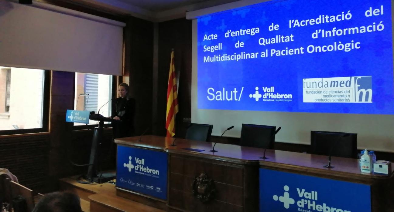 El Servicio de Farmacia del Hospital Universitari Vall d’Hebron ha recibido el Sello de Calidad en Información al Paciente con Enfermedades Oncológicas que otorga a los servicios de farmacia hospitalaria la Fundación Fundamed, avalado por la Sociedad Española de Farmacia Hospitalaria (SEFH) y cuenta con la colaboración de la Alianza General de Pacientes (AGP). Vall d’Hebron es el segundo centro del Estado que lo recibe después del Hospital General Universitario Gregorio Marañón de Madrid. El sello ha sido entregado en un acto celebrado esta mañana que ha contado con la presencia del Dr. Albert Salazar, gerente de Vall d’Hebron; Dra. Maria Queralt Gorgas, jefa del Servicio de Farmacia; Maria Josep Carreras, jefa de la Sección de Farmacia Oncohematológica; Marta Pérez, directora de Public Affairs y Comunicación de Fundamed; Paloma García del Moral, directora de calidad de Fundamed, y Vanesa Roig, Market Access director Iberia-BeiGene.