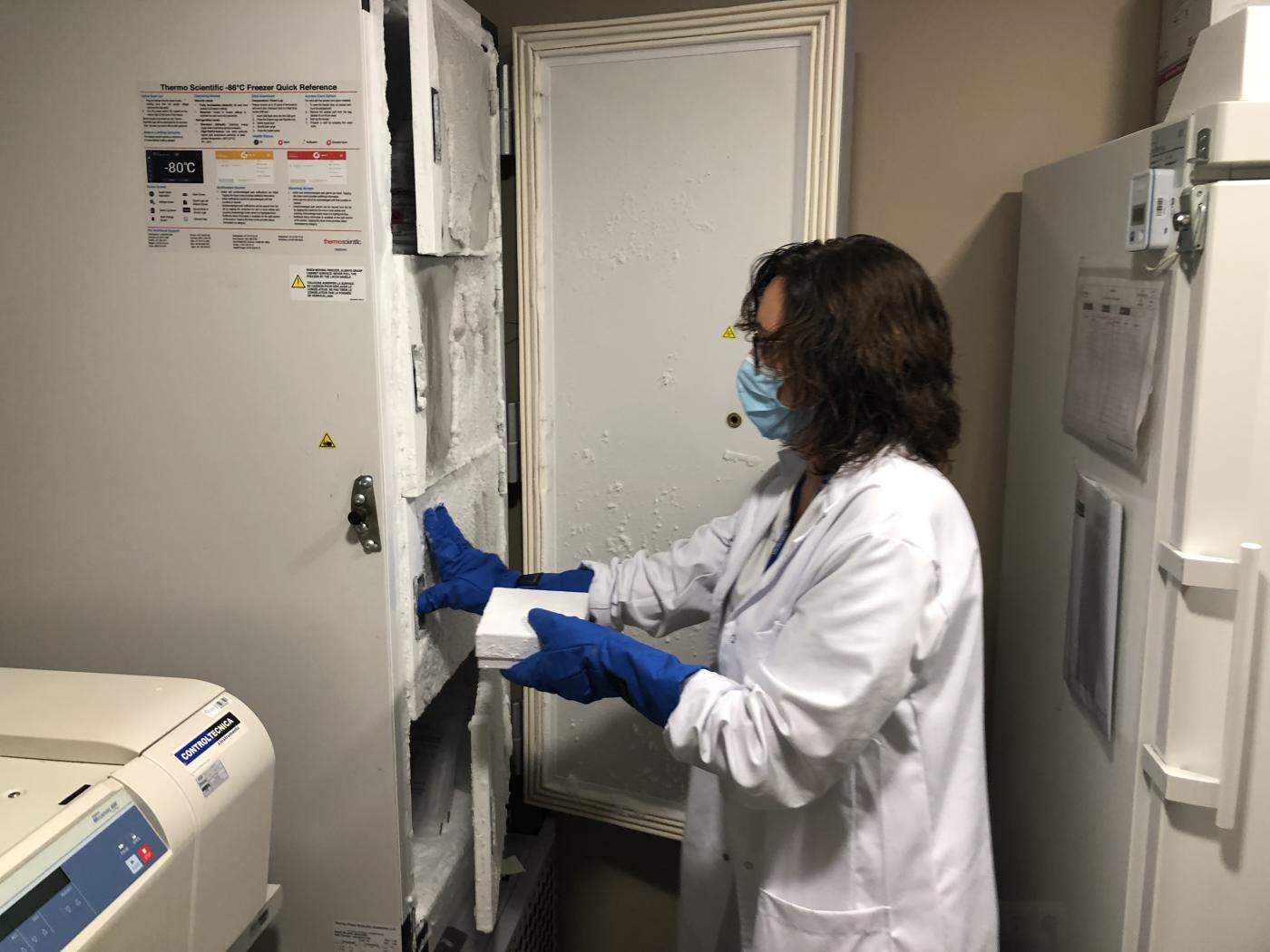 Profesional cogiendo muestras en nevera.