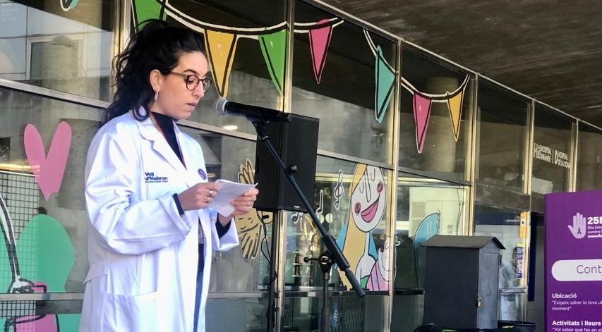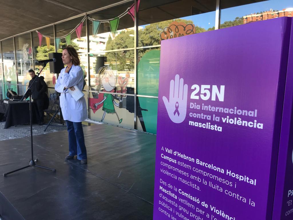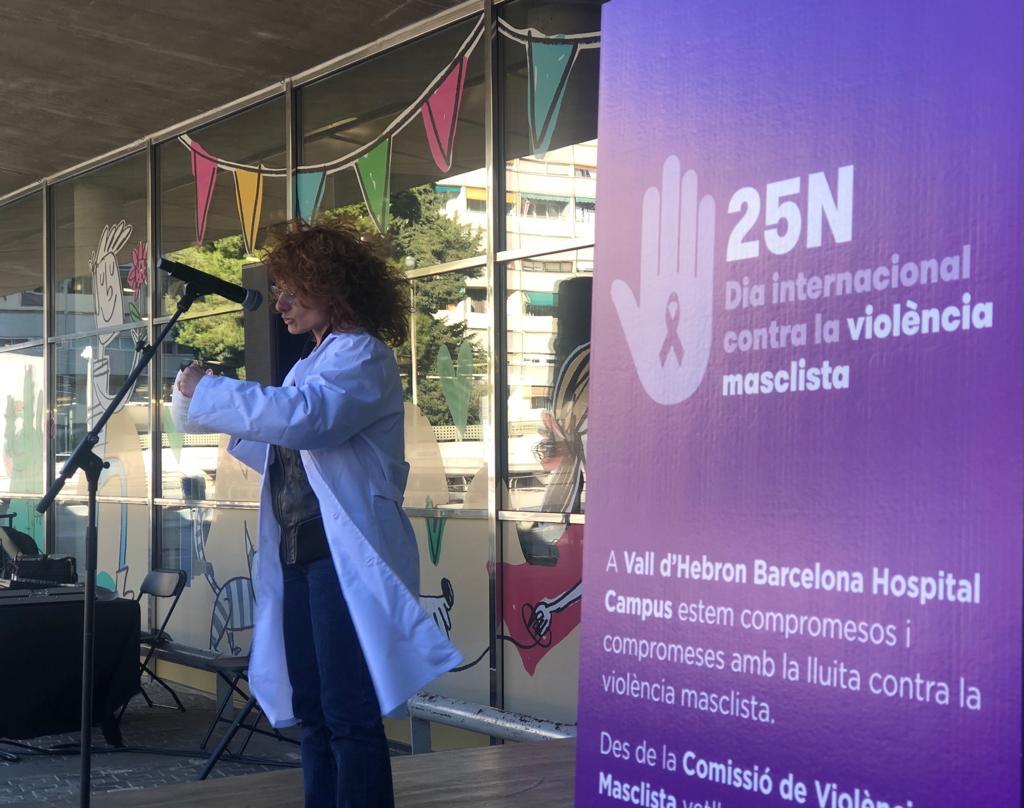 La Dra. Maria José Abadias Medrano, subdirectora asistencial del Hospital Universitario Vall d'Hebron, ha dado la bienvenida a los asistentes al acto destacando el orgullo de contar con una Comisión de Violencia Machista, con la participación de profesionales de todas las especialidades, para mejorar su abordaje en Vall d'Hebron. A continuación, profesionales del Vall d'Hebron Institut de Recerca (VHIR), el Vall d'Hebron Institut d'Oncologia (VHIO) y el Centre d'Esclerosi Múltiple de Catalunya (Cemcat) han hecho discursos condenando la violencia machista. La antropóloga Dra. Serena Brigidi, investigadora de Medicina Materna y Fetal del VHIR, ha destacado la importancia de la perspectiva de género para luchar contra la violencia machista, la más visible y la que no es tan evidente.